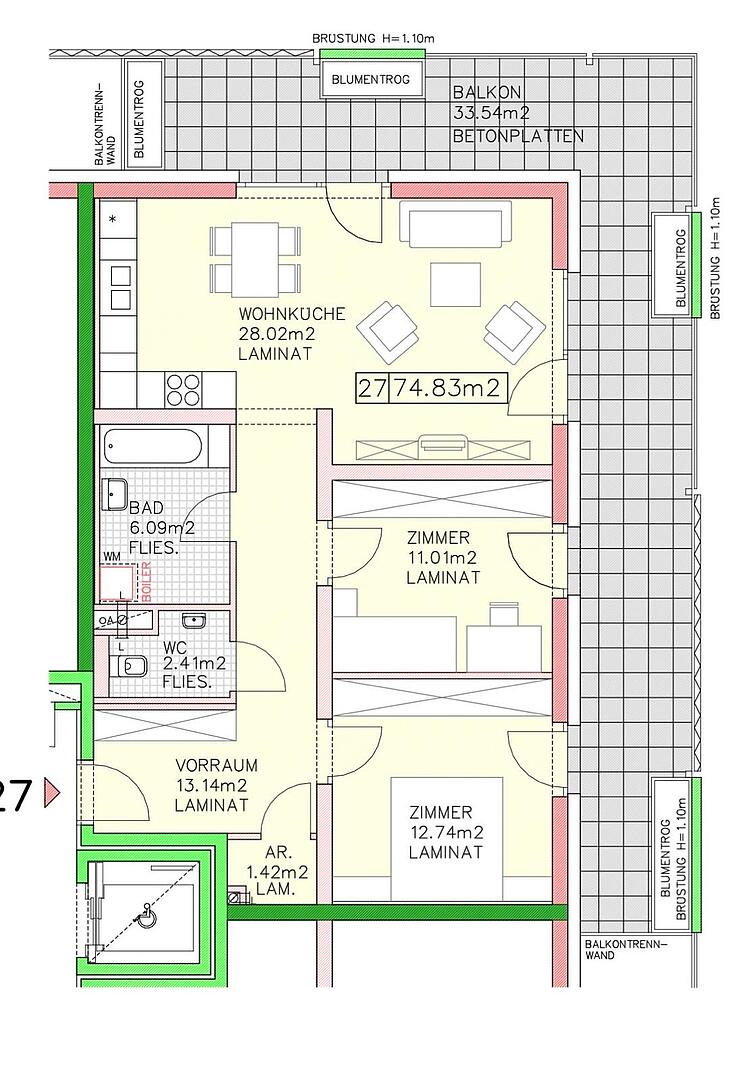 Ausstattung und Freiflächen: - Wohnung im 4. Stock, ist bequem mit dem Aufzug erreichbar - Baujahr 2022 - Einbauküche inkl. elektronische Geräte - Badezimmer: begehbare Dusche/ keine Badewanne vorhanden - teilmöbliert/ möbliert - Böden: Laminat und Fliesen - Rollläden sowie Insektenschutz vorhanden - Klimaanlage - Balkon: ca. 30 m2 - Parkplatz: 2 Stellplätze in der Tiefgarage (Parkliftsystem) - Kellerabteil - Abstellraum (Kinderwagen/ Fahrräder)